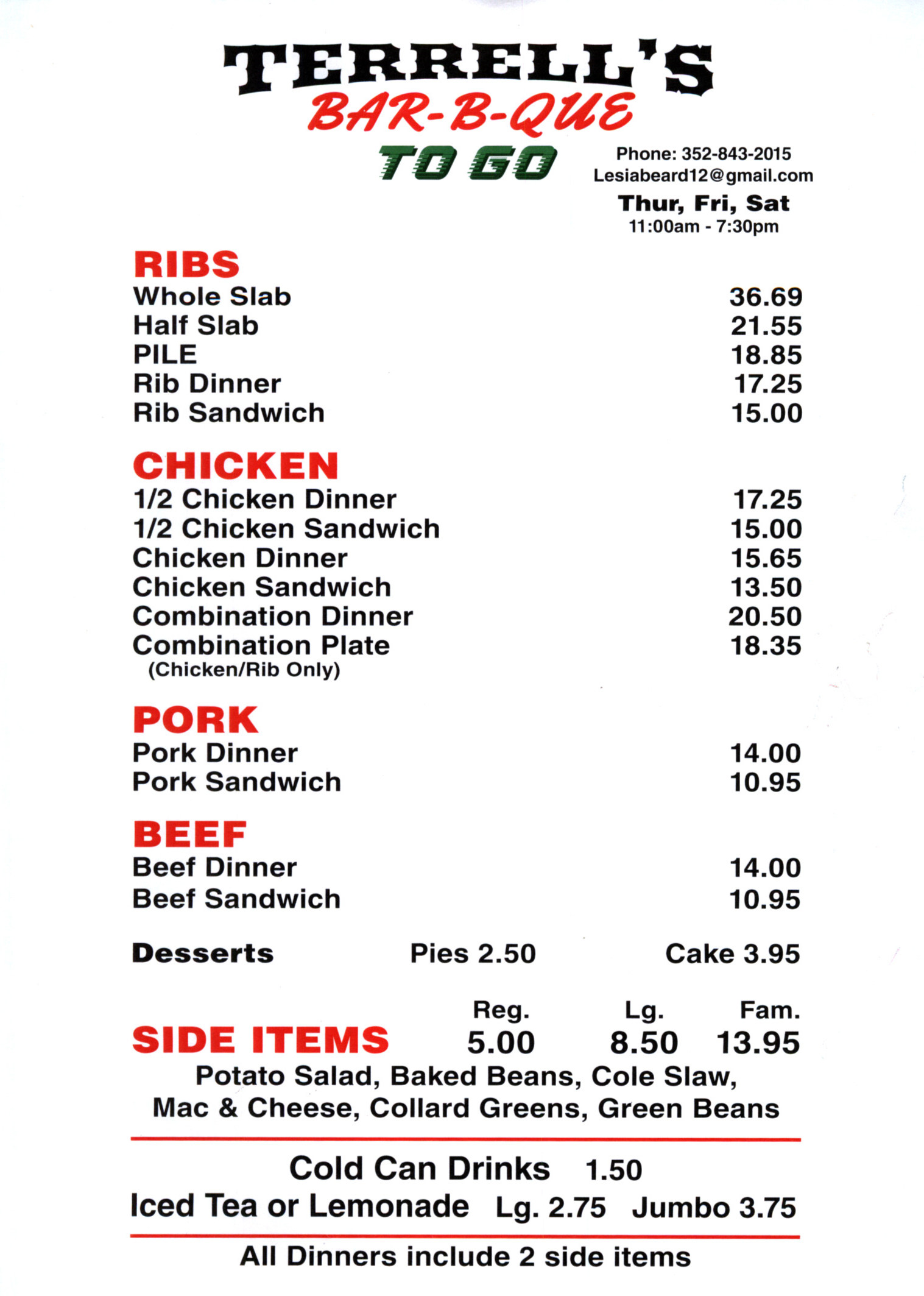 | Combo Plate/Dinner (Ribs/Chicken) When you can't decide, get the best of both worlds with two pieces of chicken cooked to perfection, and tender ribs all smothered in Terrell's Famous Bar-b-Que Sauce. Dinner with two side items. |